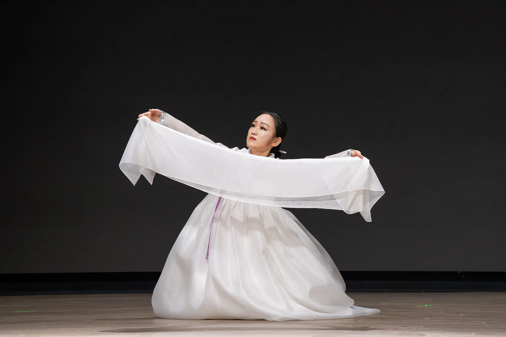 Seungmu, known for its long flowing sleeves and drum sequences, expresses a spiritual journeyโfrom inner conflict to tranquilityโthrough restrained movements and deep, controlled breathing.